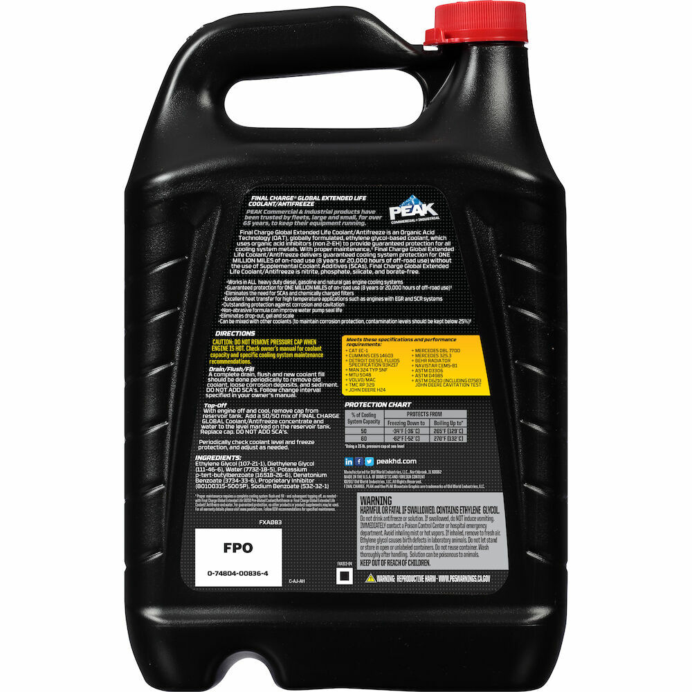 PEAK® FINAL CHARGE GLOBAL CONCENTRADO Es un producto formulado en base a monoetilenglicol e inhibidores de corrosión orgánicos que brindan un servicio de larga vida sin la necesidad de usar SCA (Aditivos suplementarios).