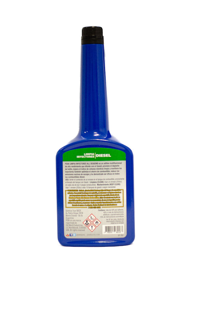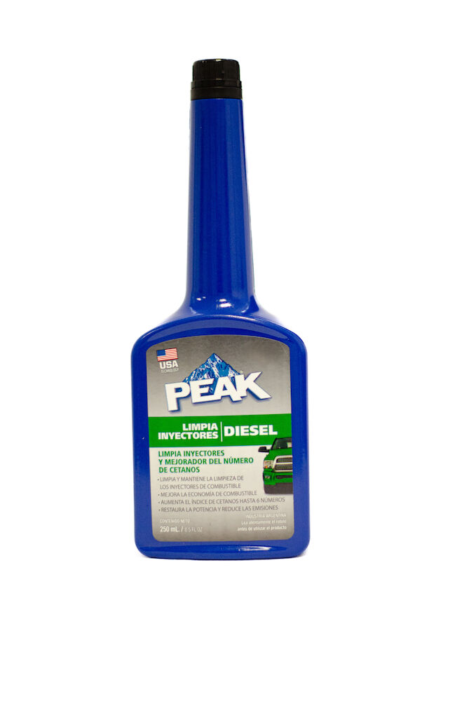 LIMPIA INYECTORES PEAK DIESEL Se trata de un aditivo multifuncional sin cenizas para gas oil formulado con aditivos sintéticos que confieren propiedades anticorrosivas, detergentes y dispersantes para ser usado en tanques de gas oil con el fin de limpiar y mejorar inyectores y combustión.