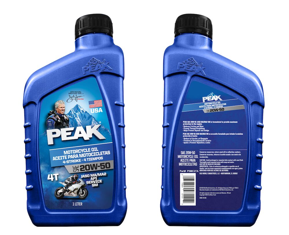 PEAK® 4T Motorcycle Oil SAE 20W-50 API SM, JASO MA/MA2 está elaborado con aceites minerales refinados con la más alta tecnología y un paquete de aditivos que está cuidadosamente balanceado para satisfacer los requerimientos de los fabricantes de motores de 4 tiempos para motocicletas ya que reduce el desgaste de las partes en movimiento, combatiendo así de manera efectiva la herrumbre, corrosión y las fallas de bujía en casos de trabajo ligero a severo. Cumple con la clasificación API SL, JASO MA/MA2, reduciendo así la formación de lodos y depósitos de carbón que causan problemas de encendido; posee características esenciales para ser usado en motores a nafta de combustión interna de 4 tiempos enfriados por agua y aire.